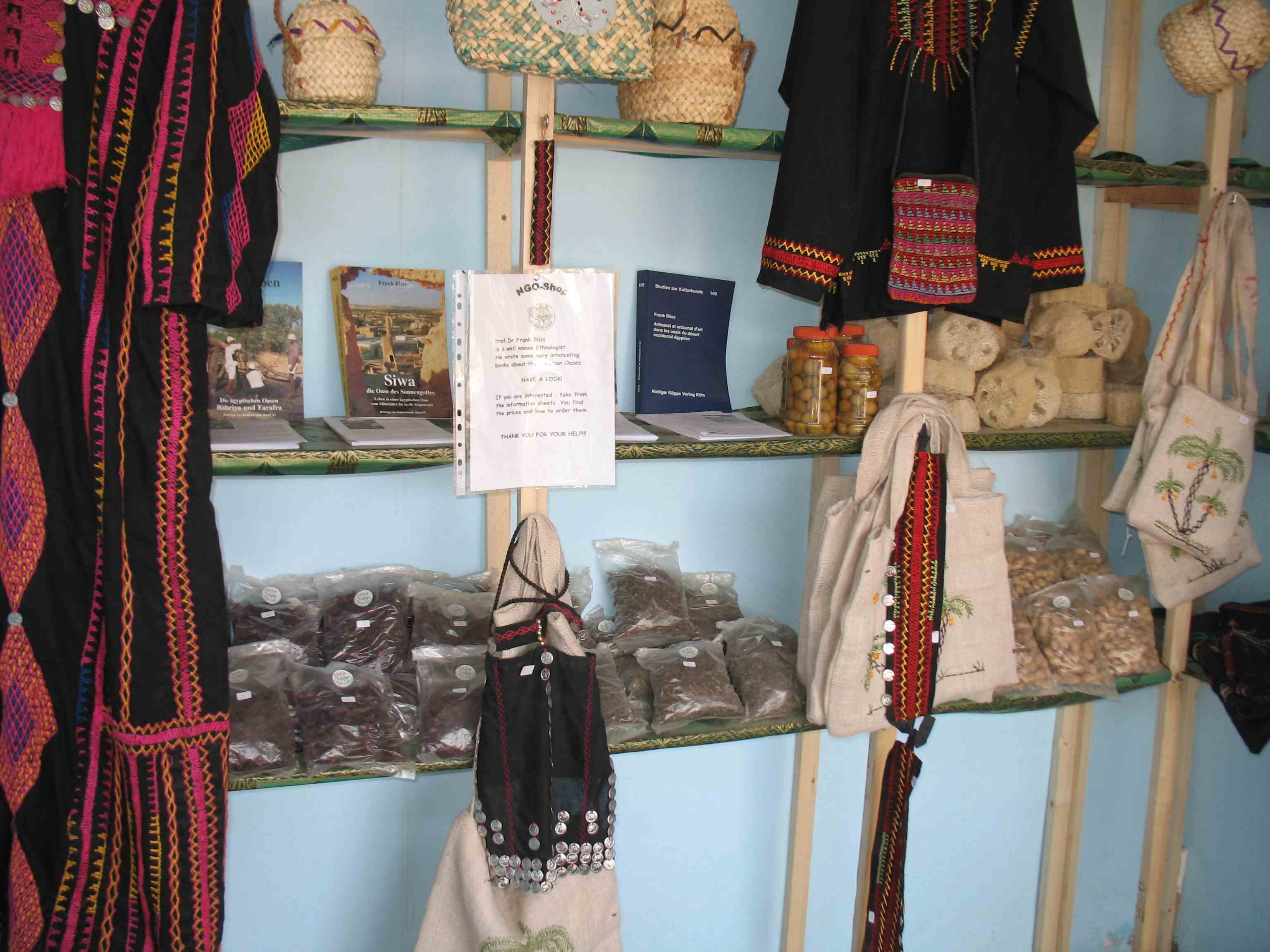 hier ansässigen Herstellern. Mit einem Aufschlag werden die Sachen dann im NGO Laden an die Gäste Bahariyas verkauft. Alle Gewinne, die der Laden erzielt, werden zur Finanzierung von sozialen Projekten der NGO benutzt.